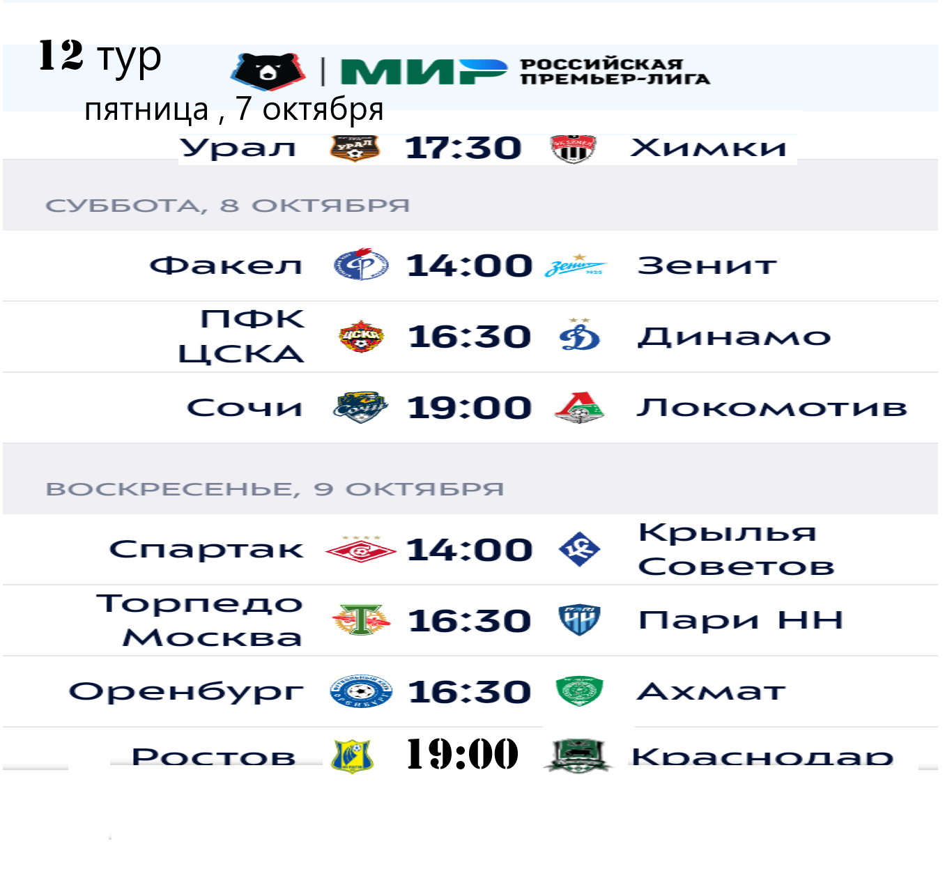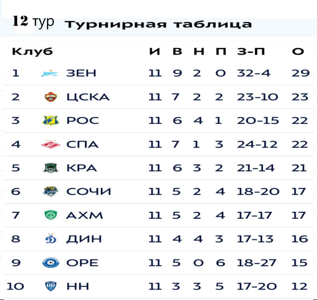 12 тур РПЛ Расписание матчей. Турнирная таблица