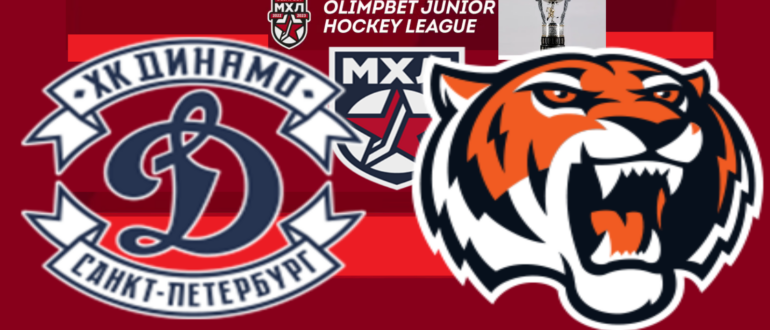 Матч регулярного чемпионата " Молодежной Хоккейной Лиги"," Олимпбет МХЛ" "Кубок Харламова" Плей-ин 1/16 финала ,между молодежной хоккейной командой МХК "Динамо" (Санкт-Петербург. Россия) и МХК "Амурские Тигры" (Хабаровск, Россия)...