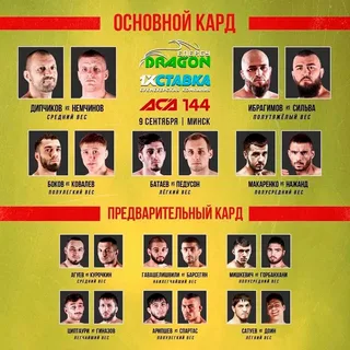 Сильнейшая лига под названием АСА снова возвращается в Минск уже 9 сентября 2022 года. Главным событием вечера на турнире ACA 144 станет бой, в котором средневес Виталий Немчинов (12-3) сразится с Николой Дипчиковым (21-9). Вторым по важности событием вечера станет бой топовых проспектов полулёгкого веса: Александр Ковалёв (10-1) встретится с Ахмадханом Боковым (7-6). Прямая трансляция пройдет на спортивном телеканале Матч ТВ а так же на нашем сайте и на Sportikus.site.