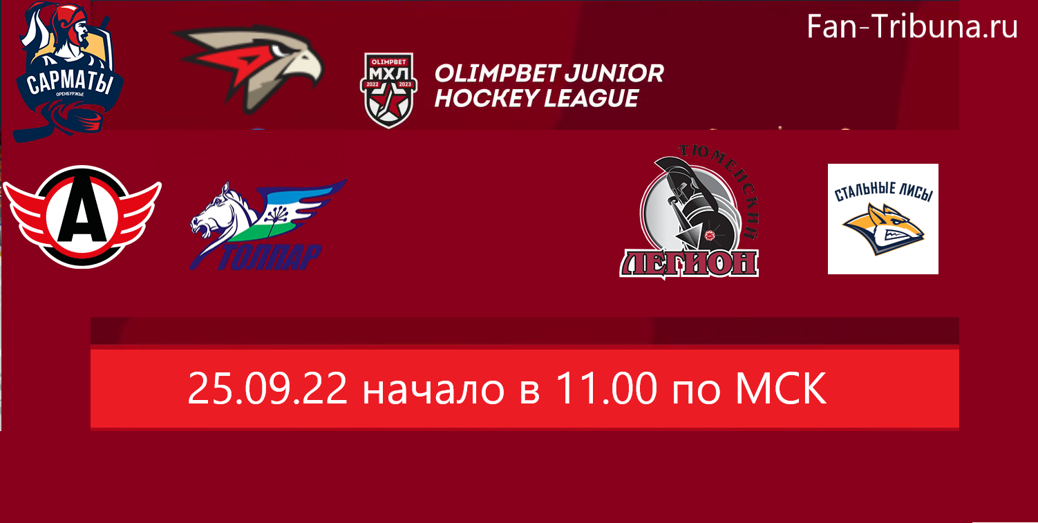 Привет всем любителям хоккея с шайбой ! 25 сентября 2022 года пройдут матчи Молодежной Хоккейной Лиги. ХК. Сарматы — ХК. Омские Ястребы; ХК Авто-ХК Толпар; ХК Тюменский Легион-ХК Стальные Лисы. Прямую трансляцию матчей вы сможете посмотреть на этом сайте, а так же на Sportikus.site. Всем удачи и приятного просмотра. Начало в 11.00 по МСК.